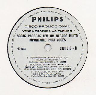 Lado A: 1 – Depoimento de Chico Buarque: Trecho de “Mucuripe” (Raimundo Fagner – Belchior) / 2 – Depoimento de Erasmo Carlos: Trecho de “Nasci para chorar/Born to gry” (Dion – Dimucci/Versão: Erasmo Carlos) / 3 – Depoimento de Nara Leão: Trecho de “Pé de sonhos” (Petrúcio Maia – Brandão)