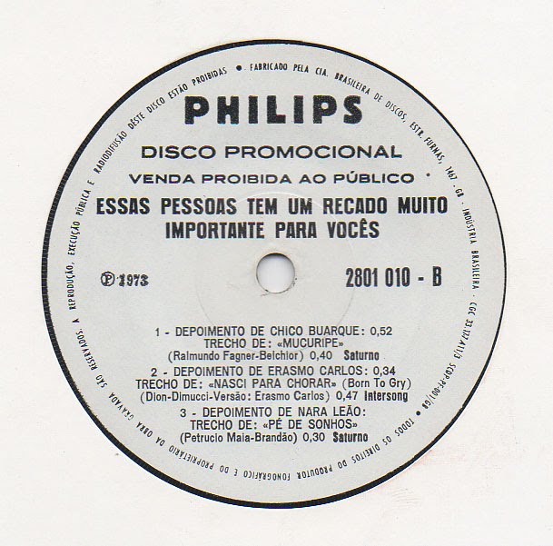 Lado A: 1 – Depoimento de Chico Buarque: Trecho de “Mucuripe” (Raimundo Fagner – Belchior) / 2 – Depoimento de Erasmo Carlos: Trecho de “Nasci para chorar/Born to gry” (Dion – Dimucci/Versão: Erasmo Carlos) / 3 – Depoimento de Nara Leão: Trecho de “Pé de sonhos” (Petrúcio Maia – Brandão)