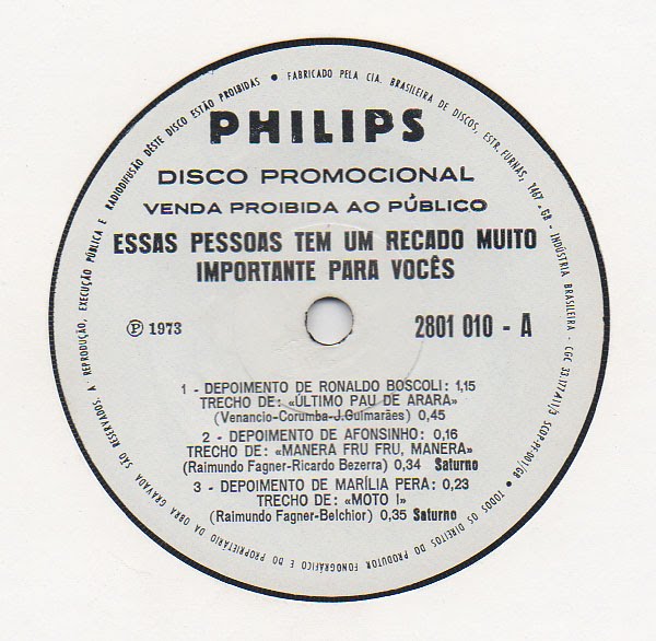 Lado B: 1 – Depoimento de Ronaldo Bôscoli: Trecho de “Último pau de arara” (Venancio – Corumba – J. Guimarães) / 2 – Depoimento de Afonsinho: Trecho de “Manera fru fru, manera” (Raimundo Fagner – Ricardo Bezerra) / 3 – Depoimento de Marília Pera: Trecho de “Moto I” (Raimundo Fagner – Belchior)