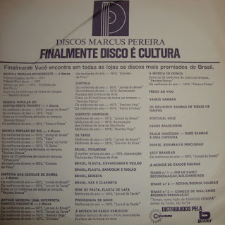 Se você for fazer uma listagem sobre os melhores discos brasileiros de todos os tempos, a Marcus Pereira marcará presença com um número impressionante para uma pequena gravadora. Não faltarão na lista os dois primeiros do Cartola, o “Na Quadrada das Águas Perdidas” de Elomar, a Orquestra Armorial dirigida pelo Maestro Guerra Peixe, o “Violão Brasileiro Tocado pelo Avesso” de Canhoto da Paraíba e muitos outros. Se hoje aparecem projetos que visam mapear a música feita no Brasil, eles copiam a sua série de 16 LPs com músicas de cada região brasileira. Eles abriram espaço para a música de estilos tão diversos quanto a Banda de Pífanos de Caruaru ao experimentador Walter Smetak.